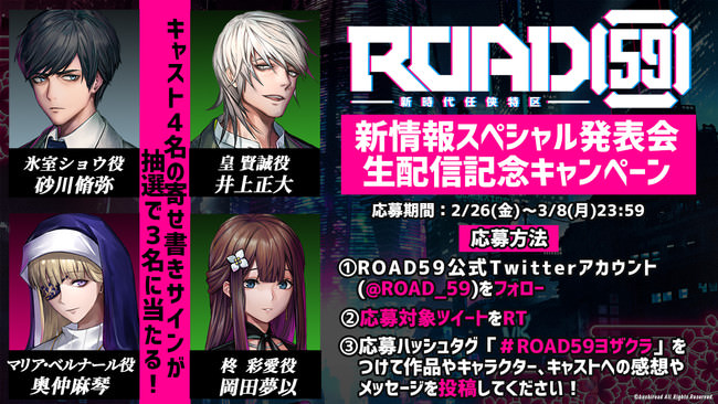 株式会社ブシロード(本社︓東京都中野区 代表取締役社長︓橋本義賢、以下、ブシロード)は、2月26日(金)にYouTube ROAD59公式チャンネルにて「ROAD59舞台目前!新情報スペシャル発表会」の生配信を行ったことを記念し、番組出演キャスト4名の寄せ書きサイン色紙が当たるキャンペーンを開始いたしました。報道関係の皆様におかれましては、ぜひ本情報をお取り扱いいただけますようお願い申し上げます。