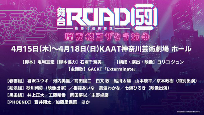 - 舞台「ROAD59 -新時代任侠特区-」摩天楼ヨザクラ抗争」4月15日(木)~4月18日(日)KAAT神奈川芸術劇場 ホールにて上演決定!チケット公式HP2次行先着申し込み受け付けスタート!