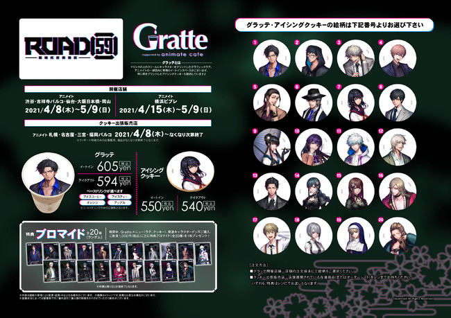 また、期間中Gratteメニュー(ラテ、クッキー)、関連キャラクターグッズご購入、ご飲食1,000円(税込)ごとに特典ブロマイド(全20種)を1枚プレゼントいたします!