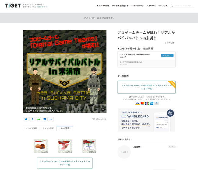 『イベントマーケットプレイス』は、grabssが運営するオンラインチケット販売サービス「TIGET(チゲット)」(https://tiget.net)内の新機能です。これまでのイベント主催者様によるオンライン動画コンテンツの提供だけでなく、イベントに関連する主催者や他の事業者による“グッズの販売”をワンストップで実現できます。