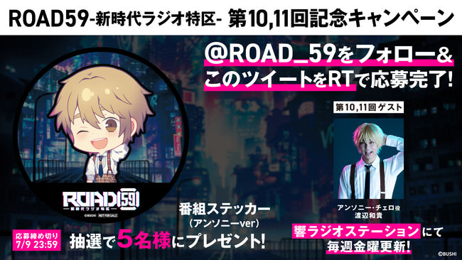 - 「ROAD59 -新時代ラジオ特区-」第10回と第11回のゲストにアンソニー・チェロ役 渡辺和貴が登場!番組オリジナルステッカーが当たるTwitterキャンペーンを開始!