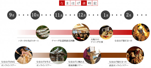 初回となるオンラインツアーは、2021年9月25日(土)に開催いたします。男鹿地域に伝わる伝統行事やなまはげ面の解説などを通し、参加者に男鹿地域となまはげについて興味をもってもらい、2回目以降の現地体験ツアー参加につなげます。