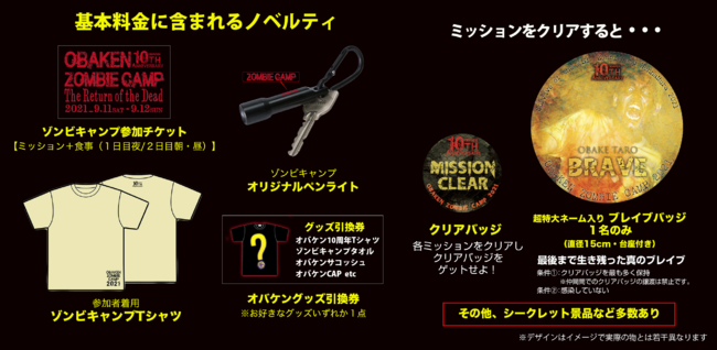 オバケンゾンビキャンプ2021では「参加者専用Tシャツ」の他に「ゾンビキャンプオリジナルペンライト」「グッズ引換券」ミッションをクリアする毎にもらえる「クリアバッジ」などノベルティも豊富。