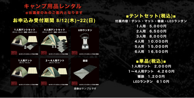 ※本年はテントの貸し出しはございません。お持ち込み頂くかレンタルとなります。レンタルに関しては当選者にのみご案内いたします。