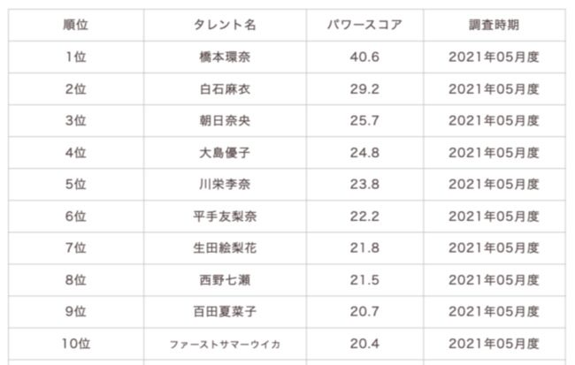『タレントパワーランキング』では、タレントパワーランキングに登録されている女性アイドルや、アイドル経験がある女性タレントのパワースコアを調査。