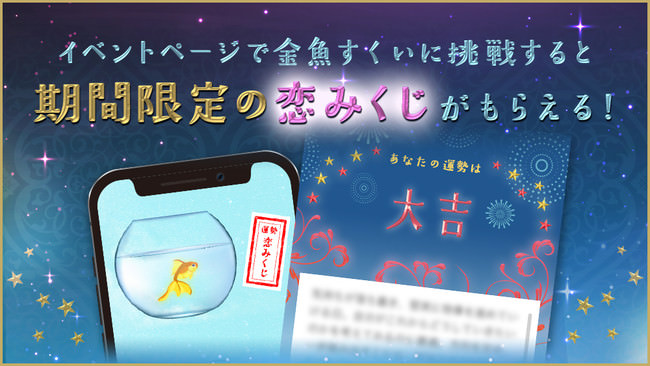 新型コロナウイルスの影響により、夏祭りなどのイベントも中止を余儀なくされる中で少しでも夏を楽しんでいただけるようにと今回のイベントを企画いたしました。『おうちで夏祭り』は、期間限定で設置された金魚すくいコーナーで遊んでいただいた後に恋みくじであなたに訪れる運気や恋愛運、開運アクションについて知ることができます。いつもとは一味違ったこの夏限定のコンテンツをご堪能ください。