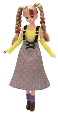 ワンちゃんをつれてオシャレにお散歩♪がテーマの「#Licca」。ディープレッドのリップとシックな色のグレンチェックのジャンパースカートで大人っぽく。高い位置で結んだレッドのメッシュの三つ編みと鮮やかなイエローのインナーで、「#Licca」らしいおしゃれ心もプラス!
