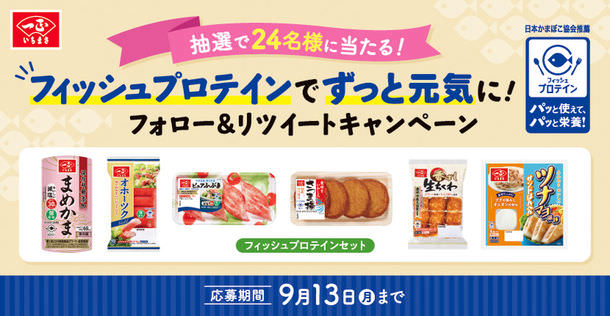 (2)公式Twitter(@ichimasa_jp)にて、フィッシュプロテインを含む6品の詰め合わせセットが24名に当たる「フィッシュプロテインでずっと元気にキャンペーン」を実施します。