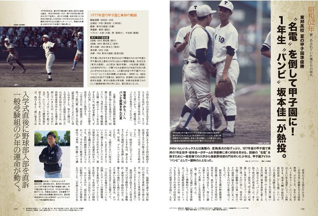 かわいらしいルックスとは裏腹の度胸満点の投げっぷり。1977年夏の甲子園で東邦の1年生投手・坂本佳一がチームを準優勝に導く好投を見せる。因縁の “名電” を倒すために一般受験での入学から強豪野球部の門を叩いた少年は、甲子園アイドル “バンビ” として一躍時の人となった。