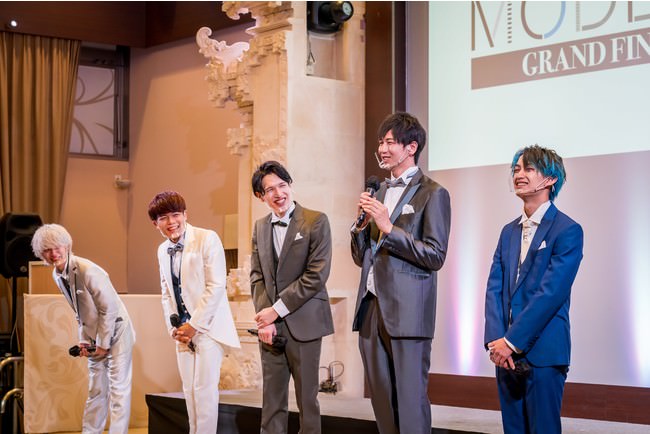 最初は男性ファイナリストのステージ。ファイナリストの5名がタキシード姿に身を包んで、一人ずつランウェイへ登場。ウォーキングを披露するファイナリストたちに、土佐兄弟の2人からも「王子様ですよ~」「あ~カッコイイ!」と終始合いの手が入れられ、無観客の会場ながらも大いに盛り上がりを見せました。