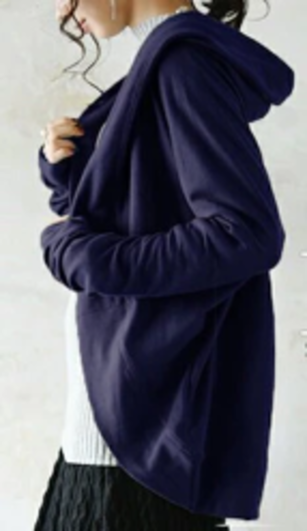 まるでボレロのようなシルエットに、ゆったりしたドルマンスリーブ&大きめのフードデザインが可愛い変形カーディガン。通気性の良い綿混素材が爽やかな着心地をサポートし、厚過ぎず薄過ぎずの絶妙な生地感のライトスウェット素材が、季節の変わり目に重宝します。お尻が隠れるくらいの着丈で、包み込むようなラウンドヘムデザインがふんわりとしたゆるシルエットを作り出してくれるので、羽織るだけでこなれたリラックス感を演出し、毎日のスタイルのアクセントになってくれそうです。