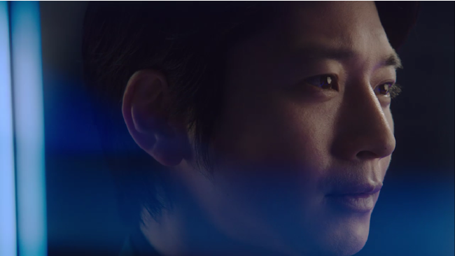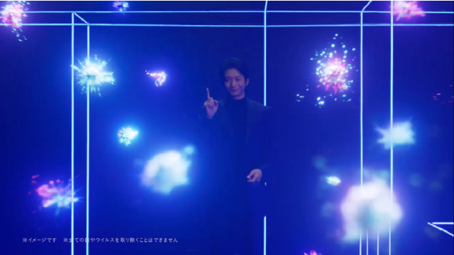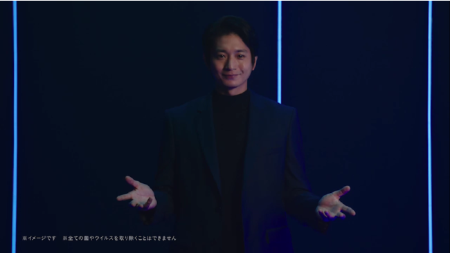 この度公開となる「ブルーデオ 光除菌篇」は和室に設置されたブルーデオのカットから始まります。空気中に 潜む菌やウイルスを可視化した空間に置かれたブルーデオに吸い込まれると、ライトが交差する演出とともにス ーツ姿の向井理さんが歩いて登場します。「そんな見えない敵と戦う、空気清浄機の新技術」という台詞とともに 向井理さんの周りに青い光線が張り巡らされます。光触媒フィルターの説明の後、「さあ、空気に光を」と指を立 てスマートに締めくくります。