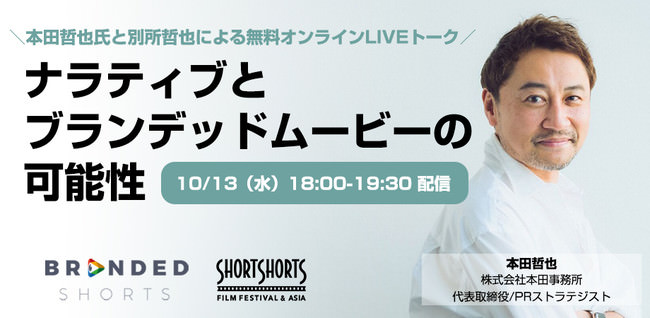 『ナラティブカンパニー 企業を変革する「物語」の力』の著者、PRストラテジストの本田哲也氏を迎え、映画祭代表の別所哲也と共に、「ナラティブとブランデッドムービーの可能性」をお話頂きます。 ショートフィルムに必要な「ストーリー」と、企業にとって益々必要になる「ナラティブ」の違い、ナラティブを意識したブランデッドムービーの事例を踏まえ、共感の先、共体験を育むナラティブの映像化に必要なポイントをお話頂きます。
