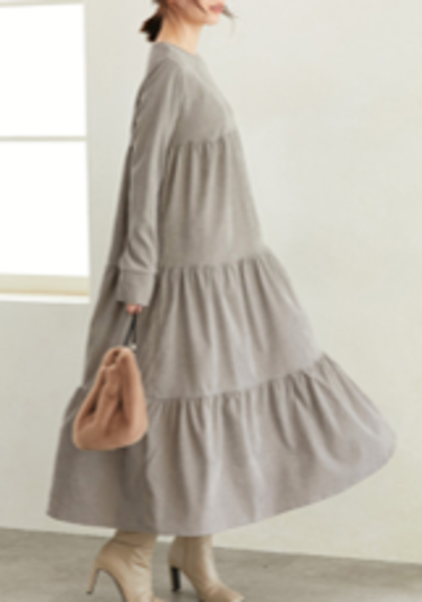 切り替えとギャザーをたっぷり使ったふんわりシルエットの“2021秋冬の新作”ワンピース。シックなカラー展開と上品なコーデュロイ素材で、ティアードデザインでも甘くなり過ぎないのもポイント。程よい開き具合のネックラインや袖口の切り替え、綺麗な揺れ感をサポートするしっかりとした裾上げ等、こだわりを感じさせるディテールは大人女性にも納得の1枚です。