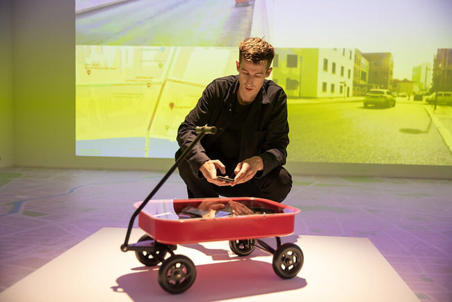 99台の中古スマートフォンを手押し車で運び、Google Maps上に仮想の交通渋滞を発生させるプロジェクト。このアクションは、Google Maps上の緑色の道を赤色に変化させ、その結果、車が渋滞に巻き込まれないように別のルートに誘導し、物理的な世界に影響を与えることができる。