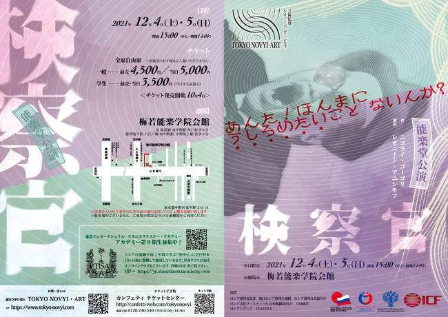 認定NPO法人 TOKYO NOVYI・ART 能楽堂公演「検察官」が2021年12月4日 (土) ~ 12月5日 (日)に梅若能楽学院会館(東京都練中野区)にて上演されます。チケットはカンフェティ(運営:ロングランプランニング株式会社、東京都新宿区、代表取締役:榑松 ⼤剛)にて10月4日(月)より発売開始です。