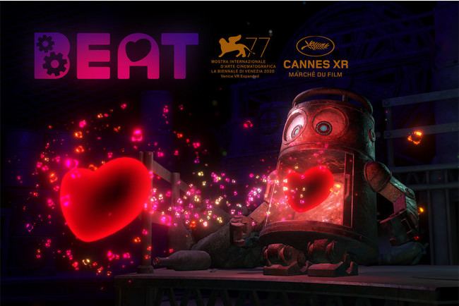 「Beat」は、⼼臓の⿎動を⼿で感じることができるHaptics(※1)(触覚)技術を⽤いたデバイスを利⽤した作品です。(※2) デバイスを⼿に持つと、聴診器で取得したユーザーの⼼臓の⿎動がデバイスに振動となって伝わり、さらには作中に登場するハートのアニメーション、⾳声とリアルタイムに同期します。これにより、⼼臓の⿎動を⽬で⾒て、⽿で聴き、⼿で感じながら作品を楽しめる仕組みです。作品の中で、⾃分⾃⾝の⼼臓の⿎動を主⼈公のロボットと共有することで、物語に命を吹き込み、物語が始まります。体験者は⾃分の⿎動を分け与えたロボットを⾃分⾃⾝に重ね合わせながら、ロボットの⼼の葛藤や成⻑を体感し、物語を楽しむことができます。新しい技術を作品に組み合わせることにより、今までにない映像体験を提供し、第77回ヴェネチア国際映画祭バーチャルリアリティ(VR)部⾨のコンペティション作品としてノミネート、続いて「CannesXR」 VeeR Future Award 2021にノミネートされています。