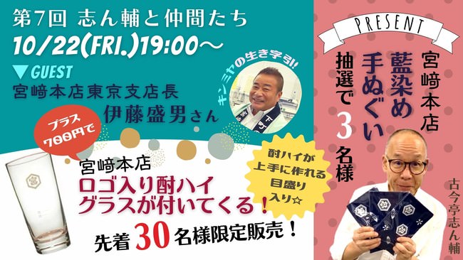 宮﨑本店の伊藤さんは「キンミヤの生き字引」として、国内外の販売を統括する一方、時間があれば寄席にも通う落語ファン。キンミヤ焼酎のおいしさの秘密、どのような戦略で販路を広げ人気商品に育ててきたのかなど、志ん輔さんがとことん突っ込みます。キンミヤのグッズなど素敵なプレゼントもあります。