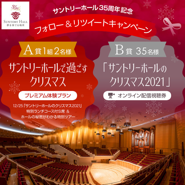 サントリーホール公式Twitterアカウント「@SuntoryHall_PR」をフォローして、「#サントリーホール35周年」「#クリスマスの特別体験プラン」のついた指定のキャンペーン投稿をリツイート!