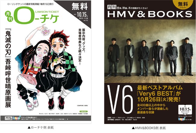 『月刊ローチケ』の表紙は、展示内容やグッズなども続々決定している「『鬼滅の刃』吾峠呼世晴原画展」。そして、『月刊HMV&BOOKS』の表紙には、最新のベストアルバム『Very6 BEST』を10月26日(火)に発売する「V6」が登場!