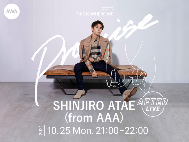 今回のイベントは、10月24日に開催されるアーティスト活動休止前最後のソロライブツアー『SHINJIRO ATAE ARENA TOUR -THIS IS WHERE WE PROMISE-』のツアーファイナルとなる福岡公演のライブアフターパーティーとなり、ライブで実際に披露されたセットリストをオンエアしながら、ライブの余韻と興奮を再現するものとなります。また、後半にはユーザーからのリクエストも受け付けますので、想い出の楽曲をたくさんリクエストしてください。LOUNGEは、どなたでも参加することができ、AWAアプリを事前にダウンロードしていれば、リクエストやユーザーとの交流など、よりお楽しみいただけます。ぜひ、ライブに参加される人も、参加できなかった人も、SHINJIRO ATAE (from AAA)の公式アフターパーティーをお楽しみください。