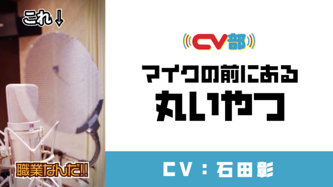 コンテンツスタジオ CHOCOLATE Inc. (本社:東京都渋谷区、代表取締役:渡辺裕介)は、本日10月27日に、身近にある「アレ」に対して、勝手に人格とキャラボイスをあてる“疑人格化”プロジェクトでチャンネル登録者数16万人を突破したYouTubeチャンネル・CV部にて、最新作「 【CV:石田彰】マイクの前にある丸いやつ(ポップガード) 」を公開したことをお知らせいたします。本作では、声優の石田彰が、録音時のノイズ除去や湿気からマイクを守るための部品「ポップガード」にアテレコし、レコーディング現場を支える影の立役者として奮闘する様子を描いています。