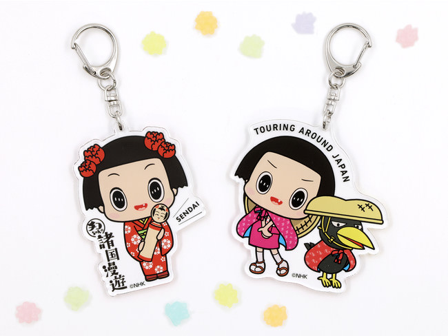 東北固有の工芸品・こけしを持った仙台限定チコちゃんグッズや、諸国漫遊のキービジュアル、旅がらすコスプレチコちゃんをグッズ化いたしました。