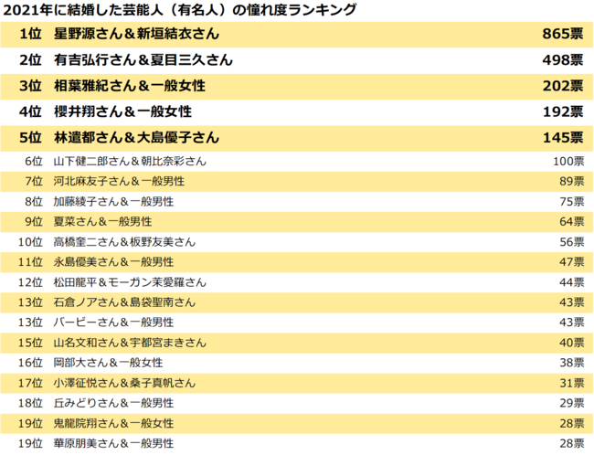 ■ 2021年に結婚した憧れる芸能人カップル第1位はリアル逃げ恥婚の星野源さん&新垣結衣さん!