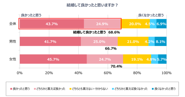 「結婚して良かったと思いますか?」という質問に「良かったと思う」(43.7%)、「どちらかと言えば良かった」(24.9%)と答えた、結婚して「良かったと思う」既婚者は全体で68.6%でした。