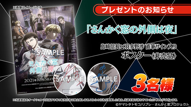 CSホームドラマチャンネルでTVアニメ「さんかく窓の外側は夜」をCS初放送する。放送を記念し、アニメで声優を務める島﨑信長、羽多野渉の独占インタビューを放送。さらに、2人のサイン入りグッズが当たるプレゼントキャンペーンも実施する。