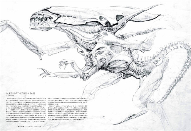 これは、『エイリアン2』のプリプロダクション時に、スタン・ウィンストンと彼のチームのために描いたエイリアン・クイーンのイラストだ。フルサイズのエイリアン・クイーンをどう動かすかという基本的なコンセプトは決まっていたが、具体的な方法を考える必要があった。私は、エイリアン・クイーンのなかに2人のスタッフを入れようと考えた。2人は背中合わせになり、頭がちょうどエイリアン・クイーンの胸部にくるようにする。左側のスタッフは、2本あるエイリアン・クイーンの左腕のうちTレックス風の小さいほうを右腕で操作する。そして左腕でクイーンの大きいもうひとつの左腕を動かすんだ。右側のスタッフも同じことだ。説明を受けたスタンは「そんな突拍子もないアイデアは聞いたことがない」と言ったが、私は「とにかく試してみよう」と説得した。まず、中に入る2人のスタッフの体形に合わせた座台をファイバーグラスを使って超特急で制作した。その座台に2人を乗せてクレーンでクイーンの胸部の位置まで持ち上げ、彼らの上から黒いゴミ袋や発泡スチロールで覆っていく。エイリアン・クイーンの頭は、約2.5メートルもある大きな発泡スチロールの芯を作り、それを座台に取りつけてゴミ袋で覆った。腕はほうきで作り、それにもゴミ袋をかぶせた。ゴミ袋のせいで全体が黒光りして、粗削りではあるがすでに映画のエイリアン・クイーンの雰囲気はあったね。