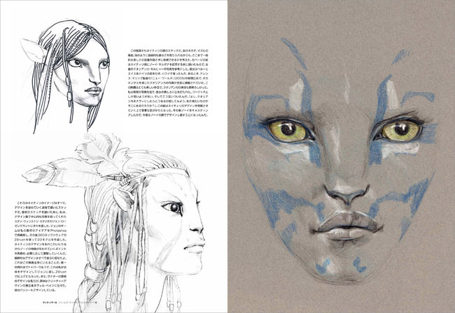 この見開きと166~167ページの絵は『アバター』のデザインをする際に描いたナヴィのコンセプトアートだ。私はよくスケッチした絵を何枚もコピーして、1枚ずつ色を変えて塗ってみることがある。ここではナヴィの肌の色をプリズマカラーの色鉛筆で塗り、縞模様を入れるなどいろんなデザインを試している。この頃は、ナヴィは指が退化して3本になった人間だという設定にこだわっていたが、そのあと人間に近い手に変更した。地球人のジェイク・サリーとパンドラに住むネイティリという2人の主人公が恋に落ちるわけだから、ナヴィの外見が人間とかけ離れたものになれば観客は違和感を持つだろうと思ったんだ。それに、ナヴィを「気味が悪い」ではなく「素敵だ」と感じてほしかったので、尻尾や耳、大きな目など猫のような特徴を持たせることにした。地球人と恋に落ちるという設定に違和感は生じなかったはずだ。