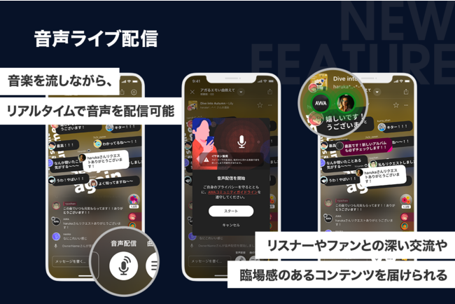 この度、音楽サブスク初となる「正規音源を流しながらの音声ライブ配信」の実現により、開催者は手軽に本格的なラジオ番組を配信できるようになるほか、アーティストは弾き語りやライブ音声の公開、楽曲に込めた想いや裏話などをリアルタイムで伝えることができ、ファンとの新しいコミュニケーションの場としての利用が可能となります。