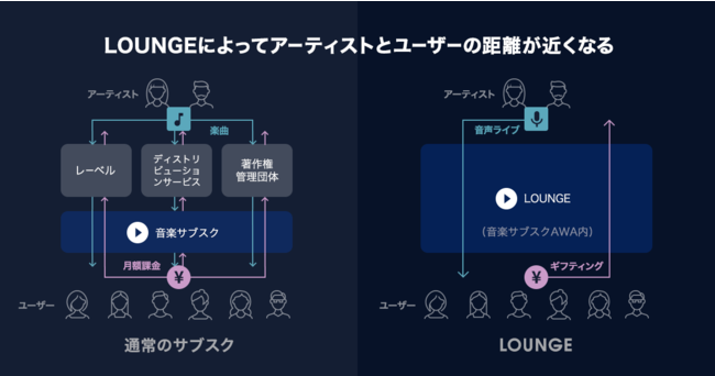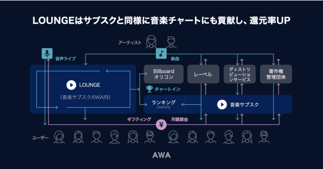 LOUNGEは、みんなで楽曲を楽しむことにより、LOUNGEに参加した人数の視聴回数がそのまま楽曲の再生回数に反映され、アーティストの楽曲の再生回数が上昇するとともに、AWAの各ランキングに反映されます。また、サブスクリプション音楽サービスの再生回数を集計している、外部のランキングにも影響が出ることがあり、新しいアーティストの応援モデルとして盛り上がりをみせています。今回、音声ライブ配信機能、応援メッセージ機能を追加したことにより、さらなるアーティストへの応援を実現しています。