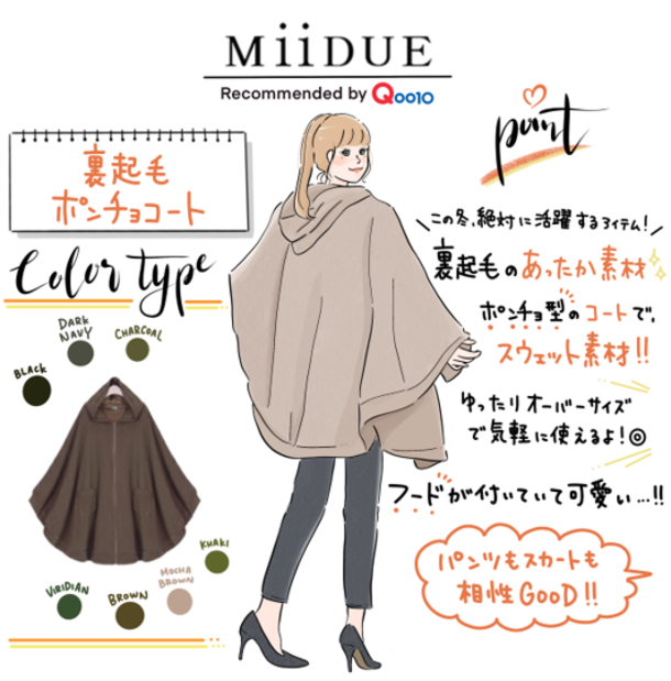 人気のコーナー、Qoo10 コーデ『今日のりおポチ』では、内田理央さんのこの冬のおススメファッションアイテムとしてMiiDUE(ミイデューエ)の裏起毛ポンチョコートが紹介されました。