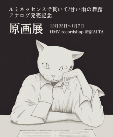 また、今年8/31にリリースされた3曲入りEPから「ルミネッセンスで貫いて / 甘い雨の舞踏」を収録した、7インチアナログ盤も12/22にリリースされたばかりで、そのアナログリリースを記念して松木本人が描いている、アートワーク(アナログジャケットの絵や特徴的な猫絵柄のアーティストイメージ画)など数点を展示する原画展も、HMV recordshop 新宿ALTAにて開催中。今回の新曲「人生の銀幕」のジャケットの原画も展示されているので、ぜひこの機会に松木美定の音楽だけでなく、絵の才能もぜひその目で確かめてみて欲しい。