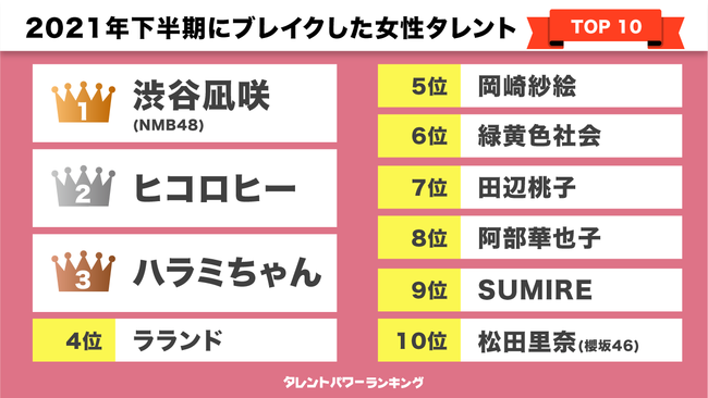 『タレントパワーランキング』では、様々なジャンルで2021年下半期に活躍しブレイクしたタレントについて、男女別でそれぞれランキング形式にまとめました。