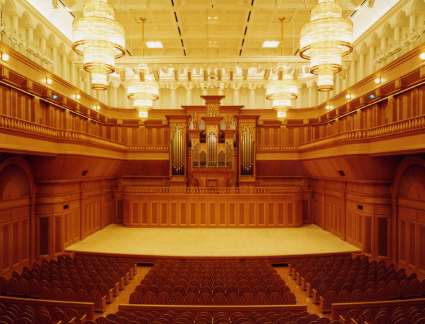708席というクラシック音楽を楽しむには絶好の大きさと残響2.1秒(空席時)という響きがサラマンカホールの特徴です。ピアニッシモの音が力を失わず客席の隅々に伝わり、オーケストラのフォルティッシモも柔らかさを失わない響きで観客を包みます。後方の席でも、音響的にも視覚的にも遠さも感じさせないホールです。