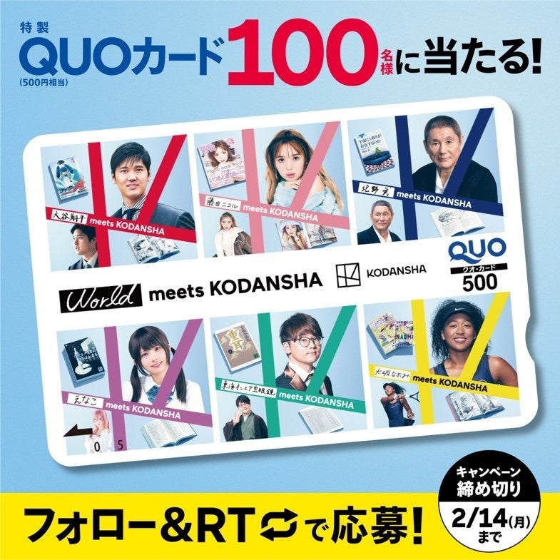 公式ツイッターアカウント(@KODANSHA_JP)のフォロー&リツイートで特製QUOカードが当たるプレゼントキャンペーンを2月1日(火)〜2月14日(月)で実施します。(応募詳細は特設サイトでご確認いただけます)