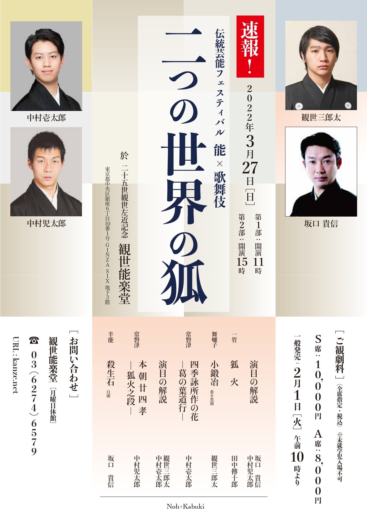 チケットは好評発売中!能と歌舞伎、二つの芸能を存分にお楽しみいただけるこの機会。是非お見逃しなく!