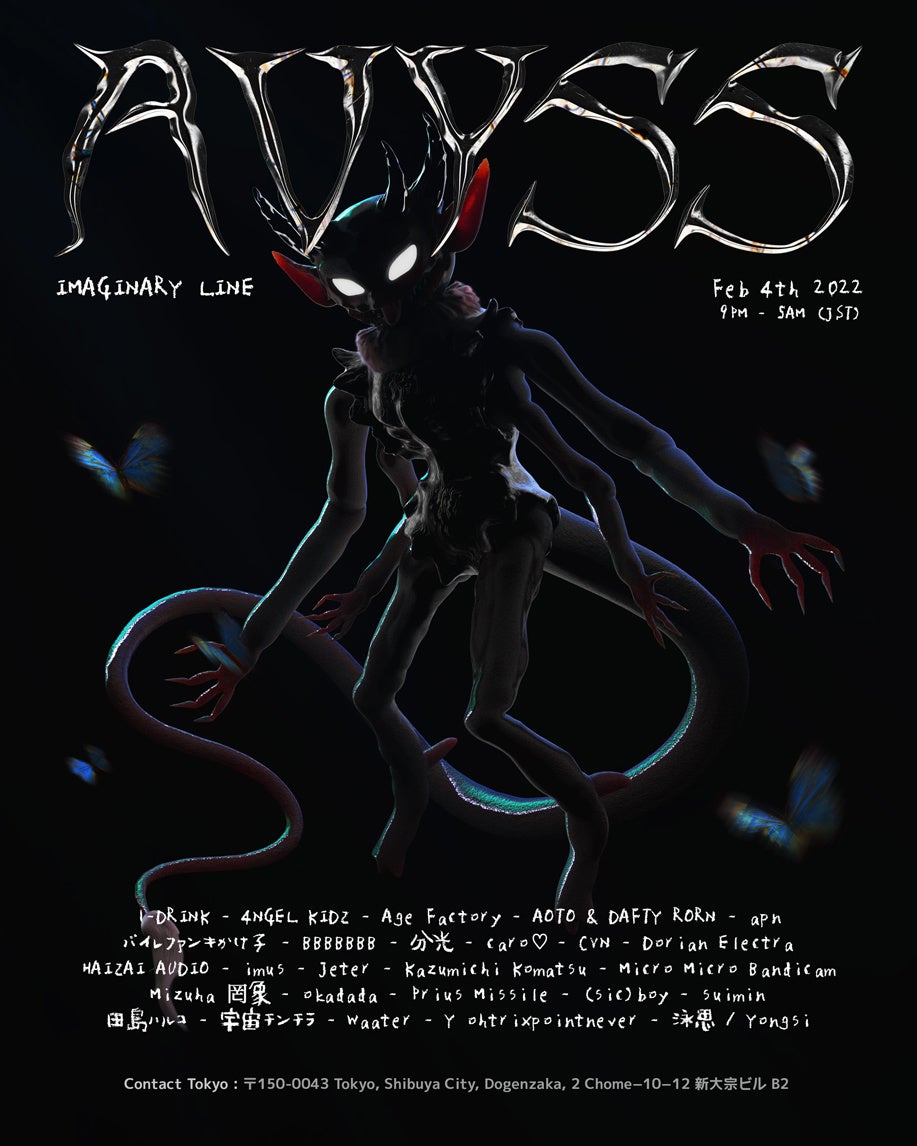 今回、展示最終日2月4日に開催されるAVYSS主催のパーティー「AVYSS Imaginary Line」が発表。展示と連動し、午後9時から翌朝5時まで続く8時間長編パーティの中で複数の仮想線が浮かび上がり、交差する。扉の向こう側で待っているのは夢か現実か、それとも並行世界か。