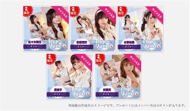 期間中のAnge☆Reveコラボグッズを最も多く獲得してくれたランキング上位1名様には、『メンバー全員があなただけの為に一曲歌います権』ならびに『メンバー全員の直筆サイン入りA3ポスター(全2種)』をプレゼントいたします。