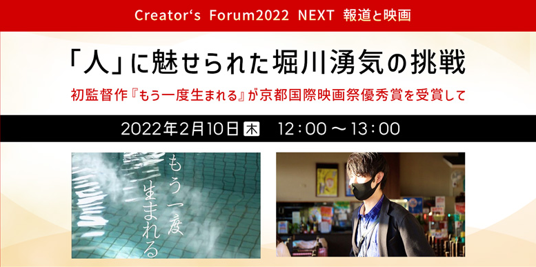 クリーク・アンド・リバー社(C&R社)は2月10日(木)、フジテレビ報道番組「Live News α」のアシスタントディレクターとして働きながら、自主制作作品『もう一度生まれる』で、「京都国際映画祭 クリエイターズ・ファクトリー2021 エンターテインメント映像部門 優秀賞」を受賞し、映画監督としてのキャリアを踏み出した堀川湧気氏登壇の「Creator‘s Forum2022 NEXT」ウェビナーを開催いたします。