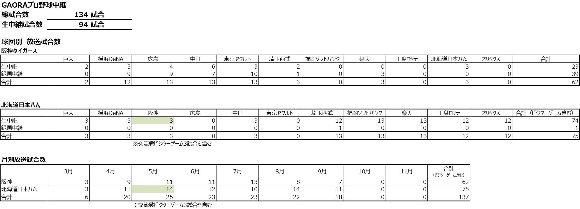 GAORA SPORTSでは、プロ野球2022シーズンの阪神タイガース、北海道日本ハムファイターズ主催試合を生中継中心に計134試合放送します。またファイターズのファーム戦も鎌スタ主催全試合をお届けするほか、タイガースファーム戦も20試合以上を放送いたします。