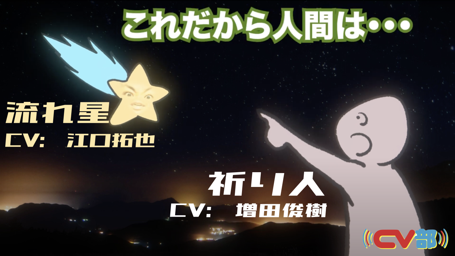 コンテンツスタジオ CHOCOLATE Inc. (本社:東京都渋谷区、代表取締役:渡辺裕介)は、本日2月4日に、身近にある「アレ」に対して、勝手に人格とキャラボイスをあてる“疑人格化”プロジェクトでチャンネル登録者数20万人を突破したYouTubeチャンネル・CV部にて、人気シリーズ「転生ガチャ〜転生したら幸せになれると思ってたら大間違いだった件〜」第2部の開始と、あわせて最新作「【CV:江口拓也、増田俊樹】流れ星に転生しました」を公開したことをお知らせいたします。本作では、これまで時限爆弾や流しそうめんマシーンなどさまざまなモノに転生し続け、今回は「流れ星」に転生した主人公を江口拓也が、突然の流れ星に願い事をしようと奮闘する青年を増田俊樹がアテレコ。流れ星に転生した人と、その流れ星に願いを込める人のヒューマンドラマを描いています。