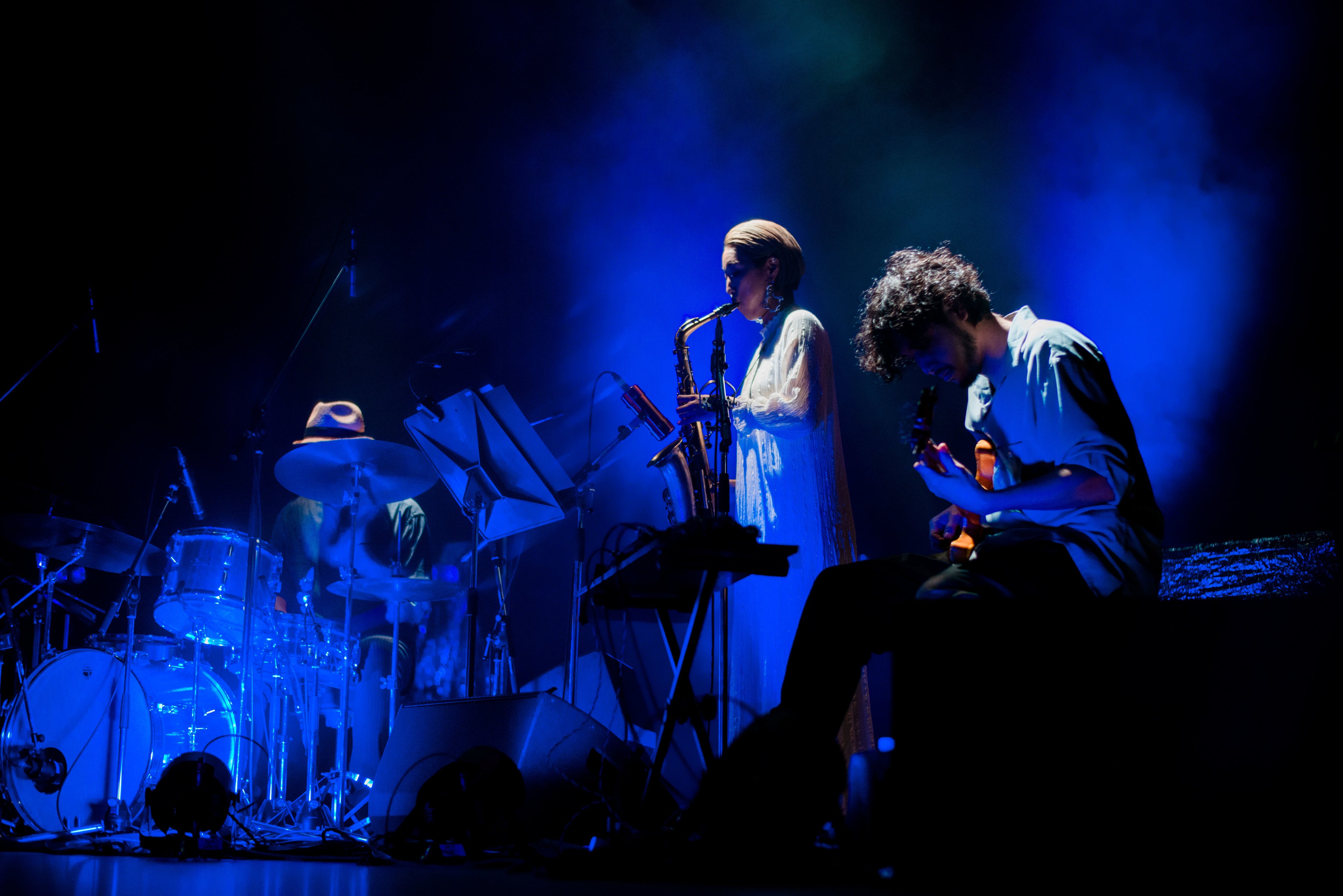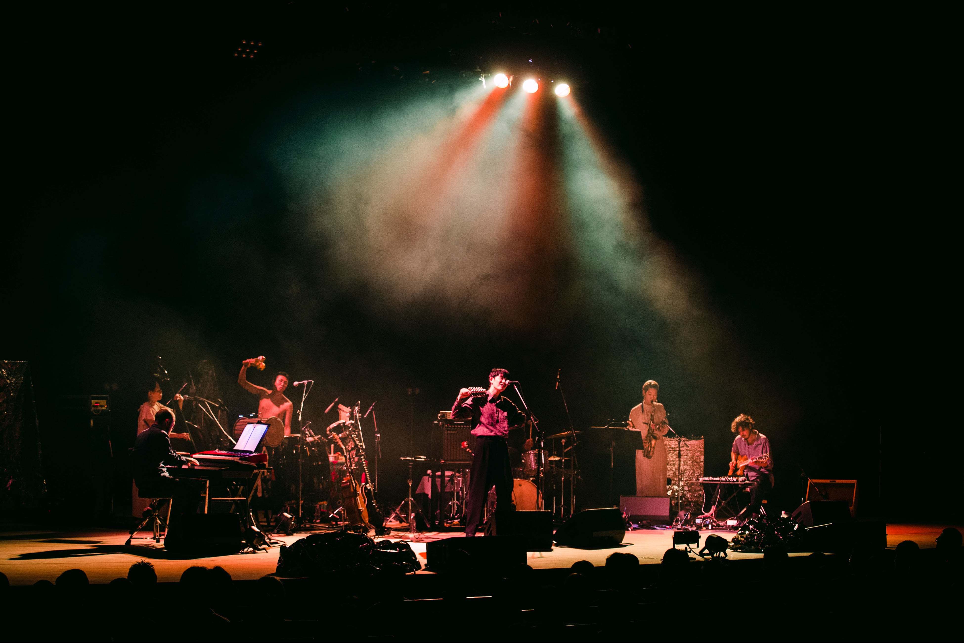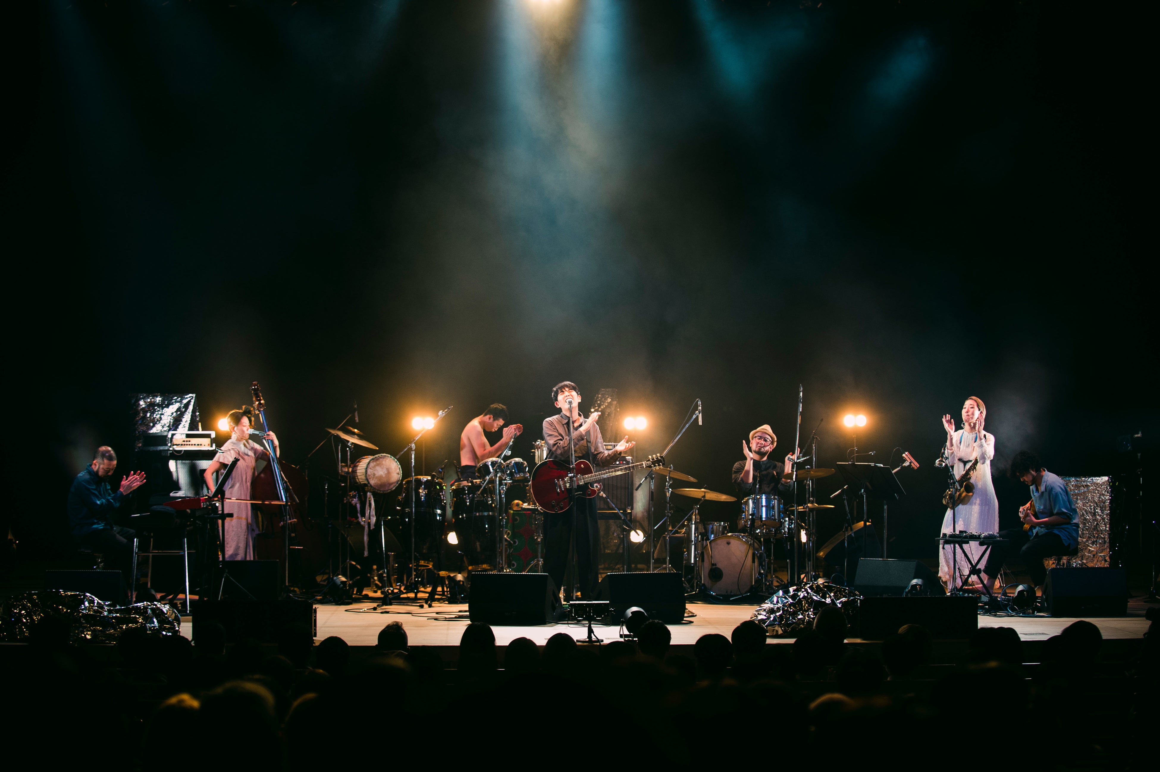 「윤슬(ユンスル)」は、美しいメロディーラインと深い残響音、フィーチャリングヴォーカル イ・ランの歌声の意味深長なリフレイン、それらすべてが合わさって詩情溢れる印象をもたらした。ステージ上にいくつか設置された銀の幕に照明が当たり煌めく情景は、月や太陽の光が水面に反映する様を意味した韓国語の曲タイトルどおりで、幻想的だった。折坂自らリズミカルにスレイベルを鳴らしながら歌う「春」は、古来の儀式を見るようでもあり、どこか未来的でもあり、時空を超えた不思議な魅力満載。折坂はただメロディーラインを正確に辿るだけではなく、ある時はくぐもった呻き声のような、ある時は詩を朗読するような、多種多様な声色を次々と繰り出して惹き付け、幻惑した。どの曲、どの瞬間も同じことの繰り返しがなく、ただただ聴き入り、観入るばかりだった。
