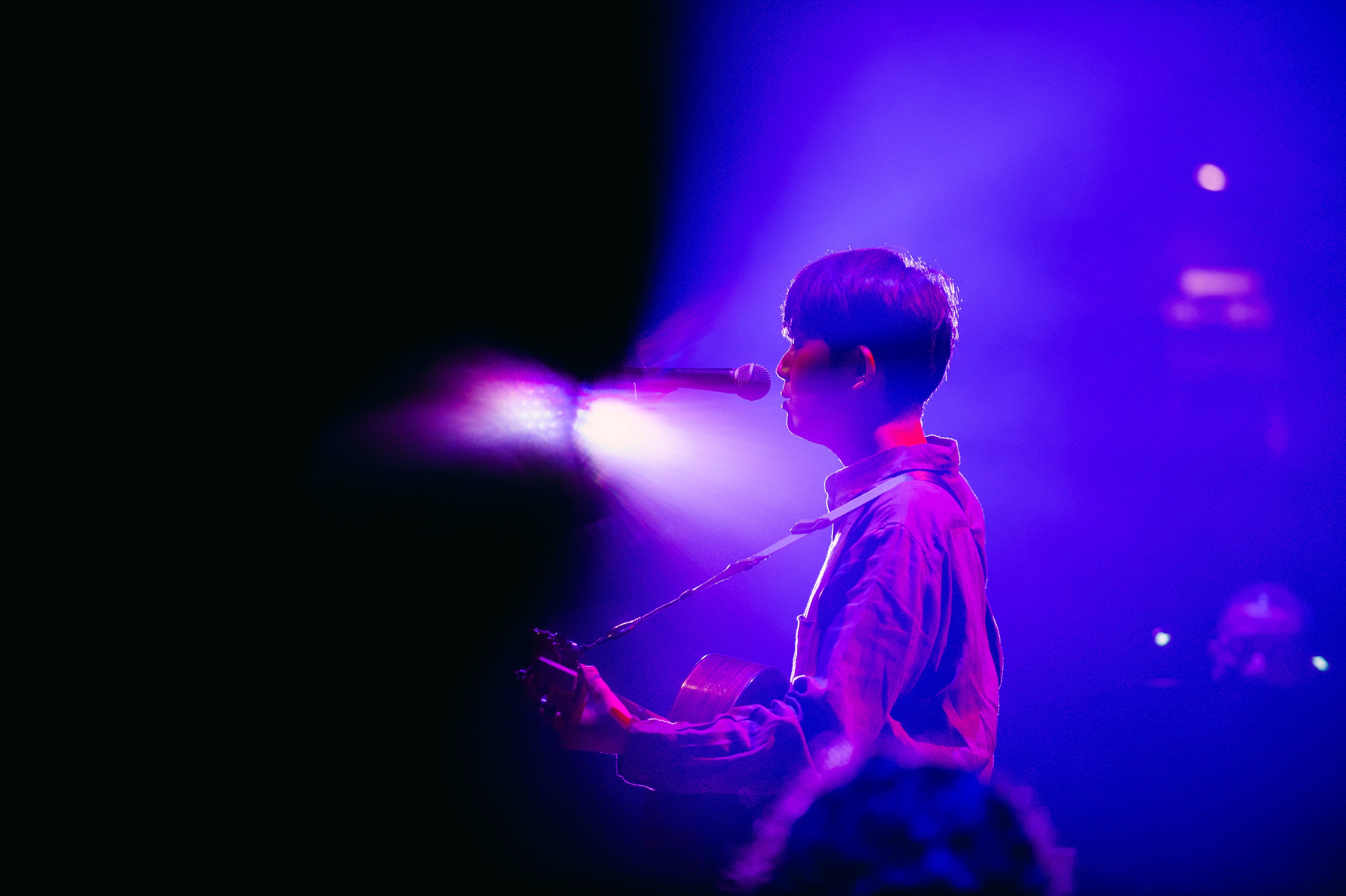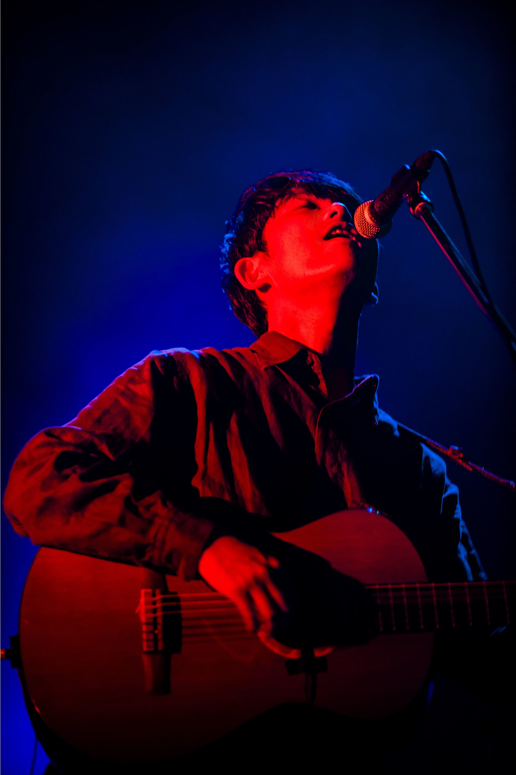 海の底、あるいは奥深い森を思わせる暗く闇に沈んだステージ。楽器の発する音なのか生き物の鳴き声なのか判別がつかない、謎めいた音が響いている。幕開けの「kohei」から、「爆発」「心」「悪魔」の4曲は、アルバム『心理』収録曲を続けて披露。穏やかな波のようなピアノフレーズで始まったのは上述の「朝顔」。客席の壁面には影絵の花のようなライトが投影される。繊細な心情を描きつつも絶望に陥らず、差し込む光を感じさせる名曲。折坂は柔らかな笑みを浮かべながら歌い奏でていた。続く「針の穴」では観客にハンドクラップを誘う場面も。かといって、通常のライブでよくある“一体感を求める”という距離感のアクションでもない。暗闇でギターを鳴らしながらの独唱でスタートした次曲「トーチ」以降、ほぼ最後まで、ステージ上は日常世界から切り離された、観る者を深く引き込んでやまない神秘の空間となっていた。
