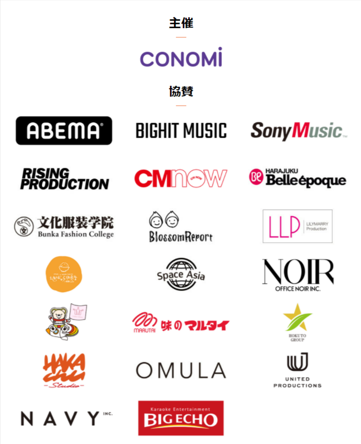 【協賛】Big Hit Music、(株)ソニー・ミュージックエンタテインメント SDグループ、(株)AbemaTV、(株)ライジングプロダクション、(株)UNITED PRODUCTIONS、NAVY.inc、CMNOW、文化服装学院、ベルエポック美容専門学校、(株)ブロッサムレポート、リリマリプロダクション、地球の子供食堂と宿題Cafe、カラオケビッグエコー、オフィスノアール、スペースエイジア、(株)HAKAchu Studio、味のマルタイ、大村美容ファッション専門学校、LittleClown、北斗グループ