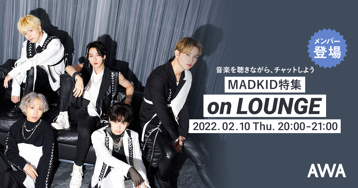 AWA株式会社(本社:東京都港区、代表取締役CEO:冨樫晃己)が運営する、サブスクリプション型(定額制)音楽ストリーミングサービス「AWA(アワ)」は、2022年2月10日(木) 20:00~21:00の1時間に渡り、オンライン空間「LOUNGE(ラウンジ)」で、圧倒的なラップワークと力強いボーカルによる、唯一無二のパフォーマンスが魅力の5人組ダンスボーカルグループMADKIDが、音声とチャットで参加する、ラジオ配信ラウンジを開催いたします。
