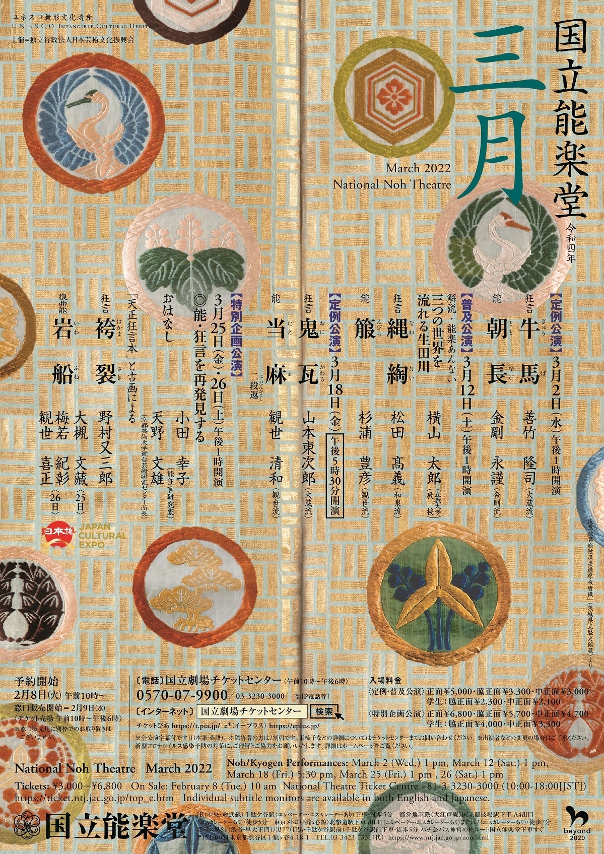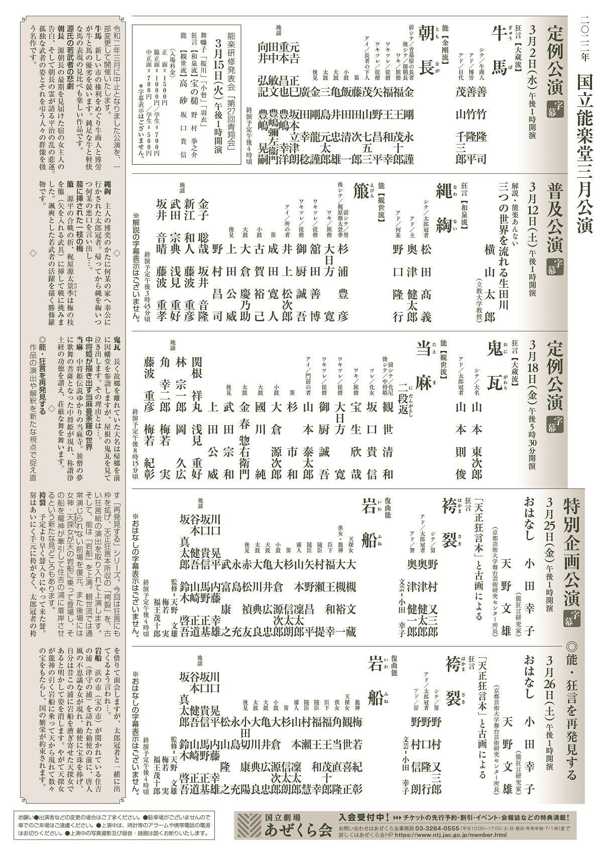 国立能楽堂主催による三月公演が国立能楽堂(東京都渋谷区千駄ヶ谷4-18-1)にて下記の通り上演されます。